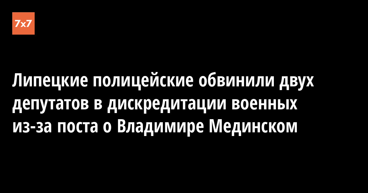 Полицейские 25 апреля составили протоколы на депутатов Липецкой облдумы Александра Ушакова и Анатолия Шкатова из-за поста в Telegram о помощнике президента Владимире Мединском, который «руководит» переговорами с Украиной. Авторы Telegram-каналов «Депутат Ушаков» и «Депутат Шкатов» напомнили, что Мединский в 2016 году открыл мемориальную доску финскому генералу Карлу Маннергейму.