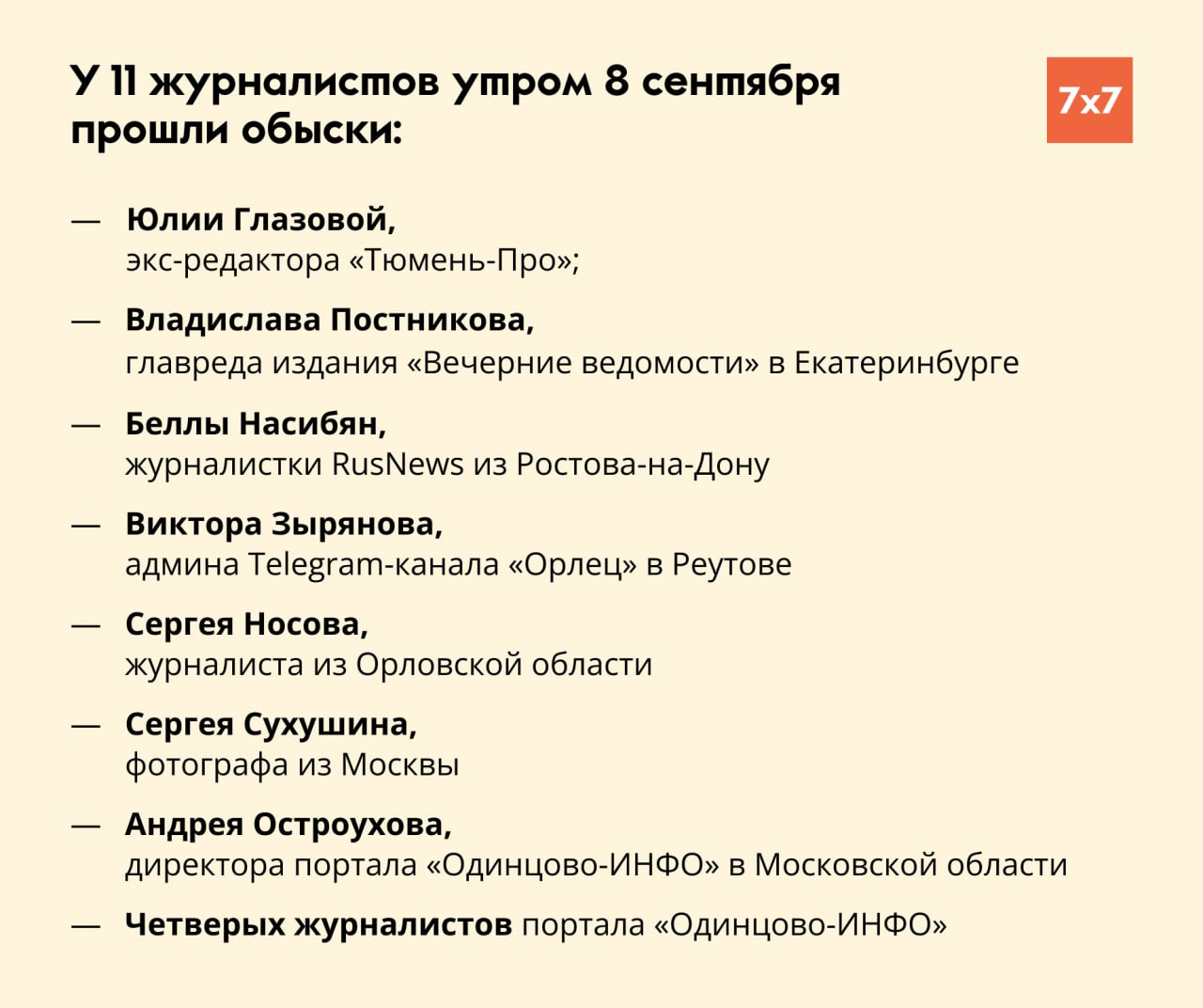 Утром 8 сентября Telegram-канал «УРАЛLIVE» сообщил об обысках у тюменской журналистки Юлии Глазовой, главного редактора екатеринбургского издания «Вечерние ведомости» Владислава Постникова и журналистки RusNews Беллы Насибян из Ростова-на-Дону. В течение дня стало известно об обысках, проходивших у орловского журналиста Сергея Носова, администратора Telegram-канала «Орлец» Виктора Зарянова и московского фотографа Руслана Сухушина. Следственные действия связаны с уголовным делом о фейках про Российскую армию, возбужденным в отношении политика Ильи Пономарёва, и его антивоенным проектом «Утро февраля».