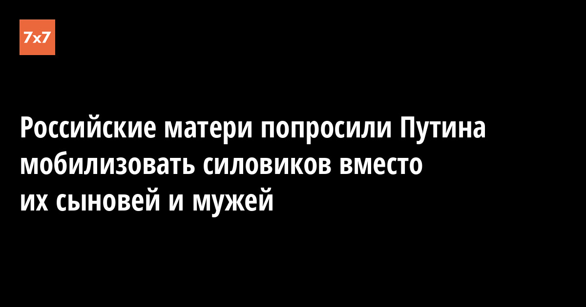 Российский Совет матерей отправил Владимиру Путину обращение с просьбой мобилизовать силовиков вместо их сыновей и мужей. По их мнению, силовики должны исполнить свой профессиональный долг и подготовлены лучше, чем мужчины в запасе. Об этом написали в Telegram-канале «ОСВР Совет матерей и жен».