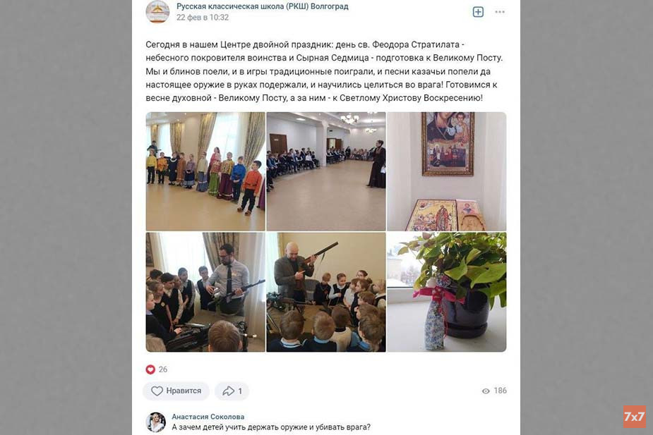 On February 22, an Orthodox Christian school in Volgograd published a post in VKontakte from a children’s holiday in which students were trained on how to handle firearms. The 7x7 media has a screenshot with scenes from the class. However, the principal called the information "an obvious provocation.”