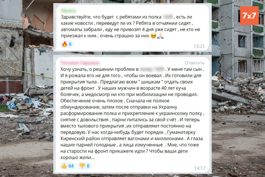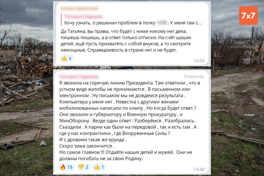 «Разобрались. Съездили. А парни как были на передовой, так и есть там. А где у нас контрактники, где Вооруженные силы? Отдайте наших детей и мужей. Они не должны погибать не за свою Родину», — написала мать одного из мобилизованных.