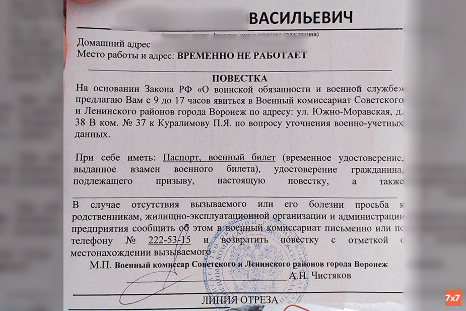 Sergei Kuzmenkov, the military commissar of Kaluga, speaking on draft notices, said that it was not mobilization but rather “the actualization of data.” Meanwhile, a resident of Voronezh told 7x7 that his girlfriend had found in a mailbox a draft notice for her landlord, who passed away two years earlier.