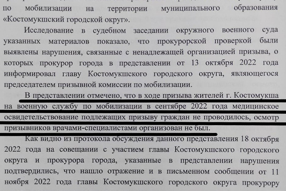 Прокуратура в октябре 2022 года провела проверку работы призывной комиссии и выявила нарушения. Сотрудники ведомства установили, что мобилизованных не осматривали врачи. Ведомство внесло представление мэру Костомукши Сергею Новгородову.