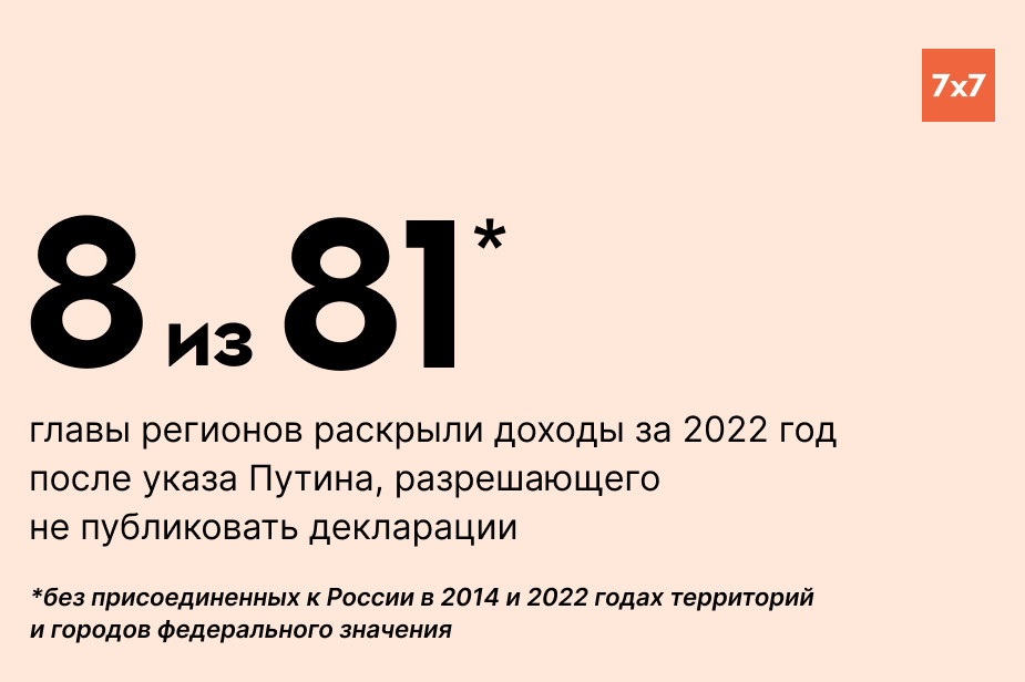 В конце 2022 года Владимир Путин подписал указ, разрешающий чиновникам не публиковать сведения о доходах и имуществе во время войны. Большинство глав регионов так и сделали. «7х7» проверил, кто из губернаторов и руководителей республик все же решил опубликовать декларации за 2022 год