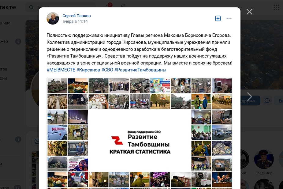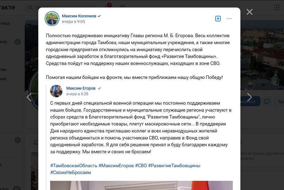 Губернатор Тамбовской области Максим Егоров предложил чиновникам собрать деньги для участников войны в Украине. После этого о переводах отчитались сотрудники мэрии Тамбова и администраций региона, работники государственных учреждений. Об этом чиновники написали в ноябре на страницах в соцсети «ВКонтакте».
