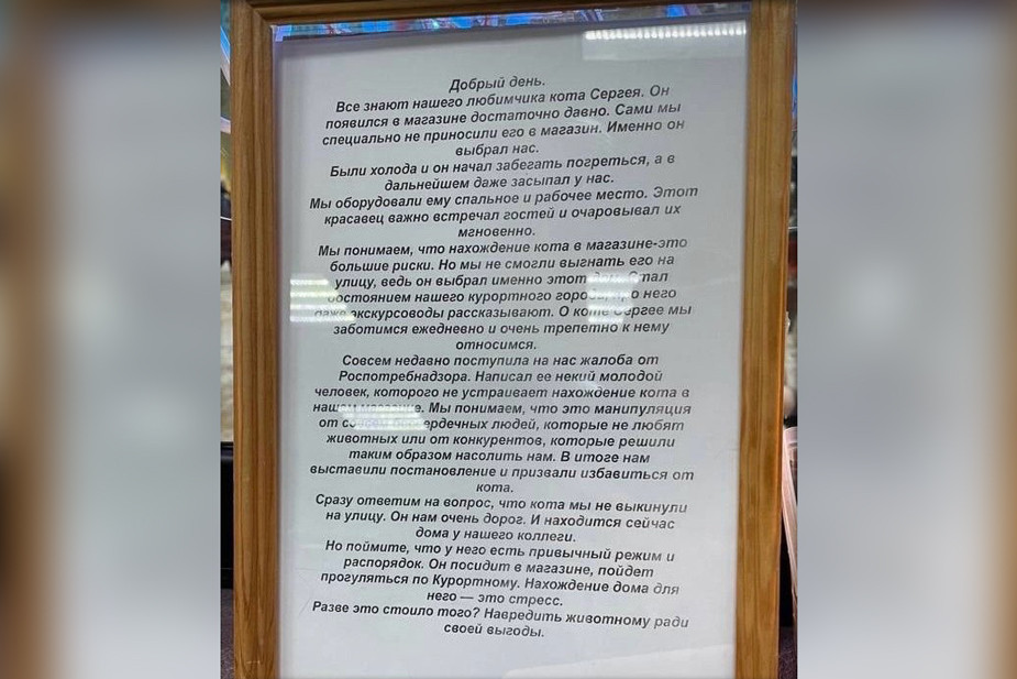 «Мы понимаем, что нахождение кота в магазине — это большие риски. Но мы не смогли выгнать его на улицу, ведь он выбрал именно этот дом. Стал достоянием нашего курортного города, про него даже экскурсоводы рассказывают», — написала Татьяна.