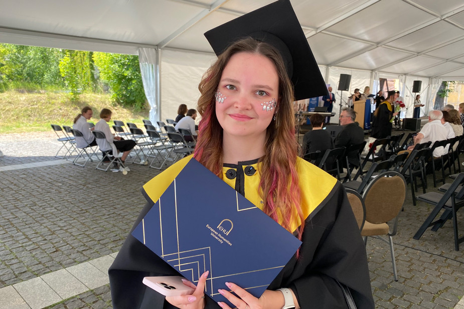 Во время рабочей поездки в Литву в мае 2022-го она узнала о том, что в Вильнюсе располагается Европейский гуманитарный университет, где можно получить журналистское образование. Плюсом было и то, что в ЕГУ преподают на русском языке. Первоначально университет работал в Республике Беларусь, но 20 лет назад власти фактически запретили его деятельность. Вуз аккредитован в Литве по аналогии с другими образовательными учреждениями, и по окончанию обучения студенты получают дипломы европейского образца.