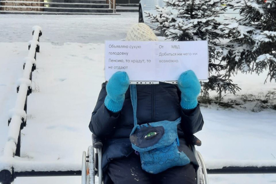 На плакате женщина написала, что она объявляет сухую голодовку. Причина в том, что ее «пенсию то крадут, то не отдают», а от МВД «добиться ничего невозможно».