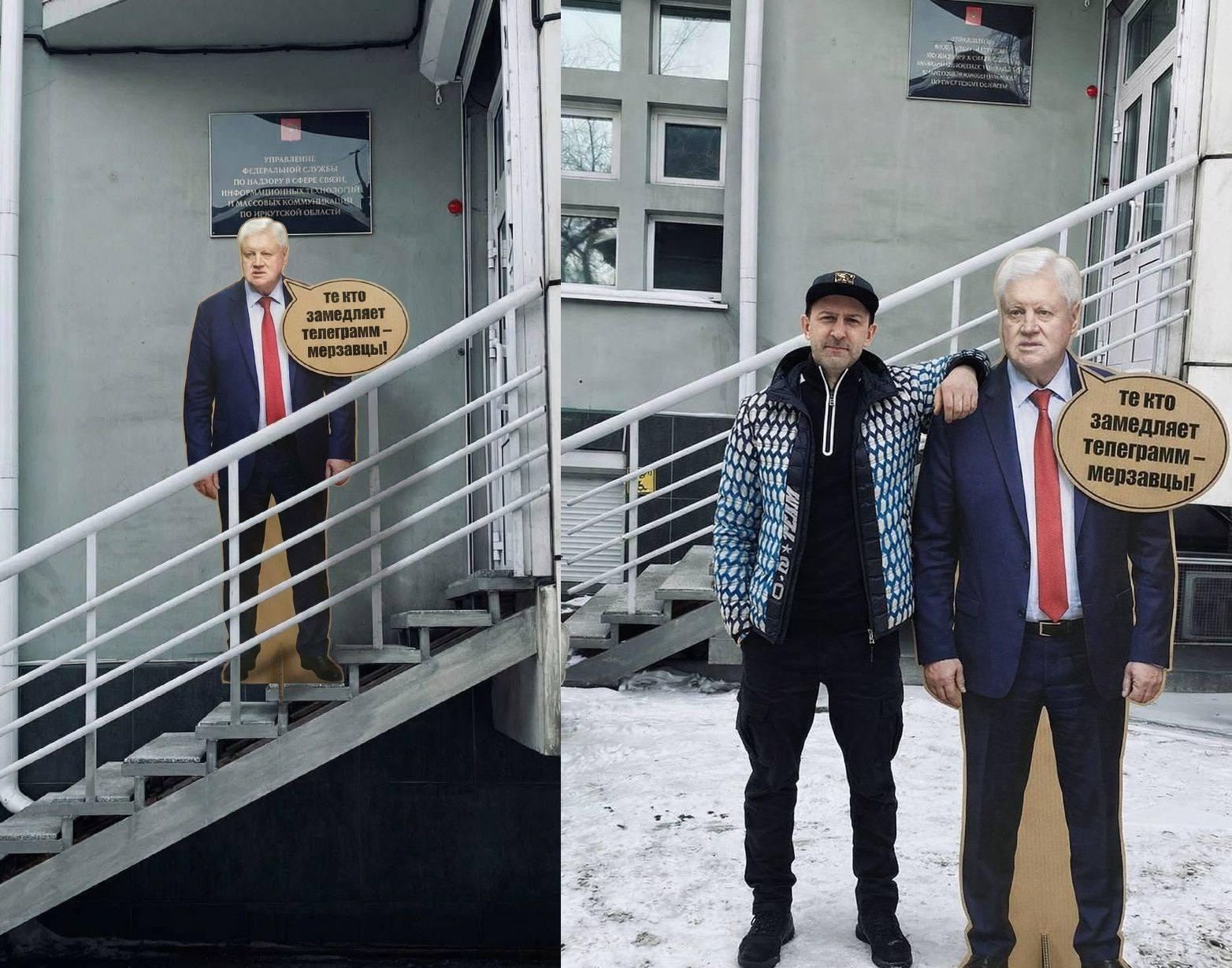 Общественник Денис Букалов установил у входа в иркутский филиал Роскомнадзора картонную фигуру главы партии «Справедливая Россия» Сергея Миронова.