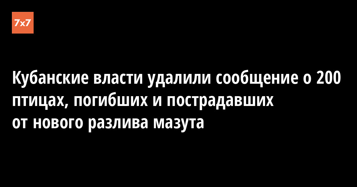 Оперштаб Краснодарского края удалил опубликованное 11 апреля сообщение о том, что на побережье Анапы за двое суток нашли больше 200 погибших и измазанных в мазуте птиц. Внимание на это обратили «Осторожно, новости».